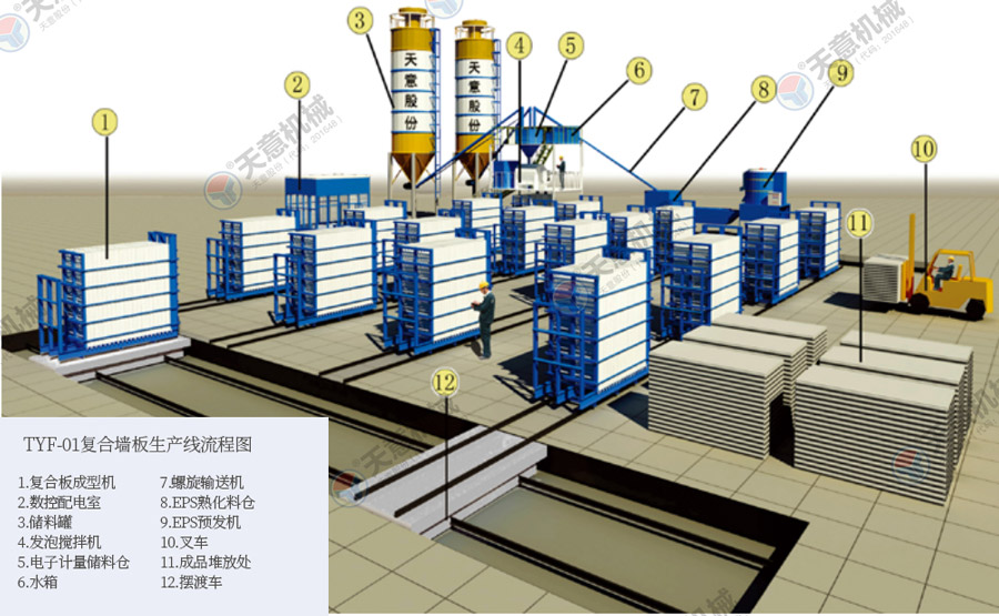 TY12型墙板生产线包括:墙板成型机、整体穿抽管系统、发泡系统、水箱、电子计量储料仓、螺旋上料输送机、储料罐、螺旋输送机、EPS熟化料仓、硫化干燥床、EPS预发机、数控配电室、发泡搅拌机、整体出板系统、叉车、成品堆放区、摆渡车。