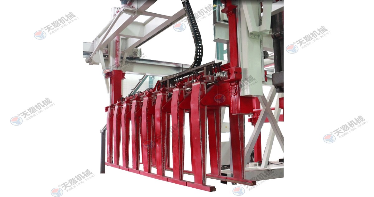 成品分垛吊机:将蒸养车上的一模坯体吊运至掰板输送机上,然后将空侧板吊运至蒸养车上;切割工段空翻脱模机将模框翻转90°,放在切割小车支座上进行脱模,脱模后的模框与清理后的侧模板进行合模,合膜后的空模框被吊...