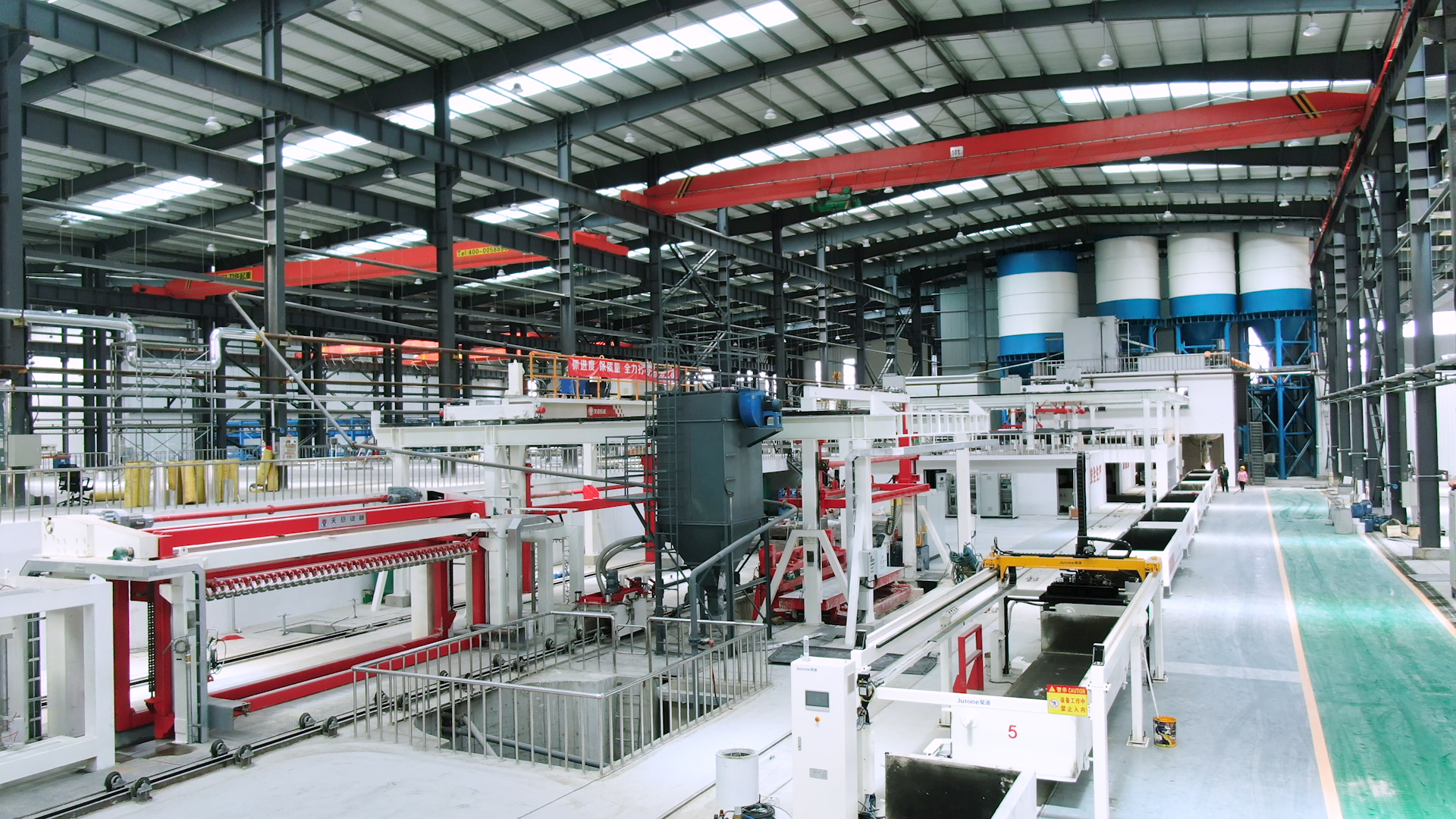 翻转吊机:抓取模箱翻转90°,侧立在切割小车上进行切割;切割工段空翻脱模机将模框翻转90°,放在切割小车支座上进行脱模,脱模后的模框与清理后的侧模板进行合模,合膜后的空模框被吊运至模具回程轨道上进行涂油处...