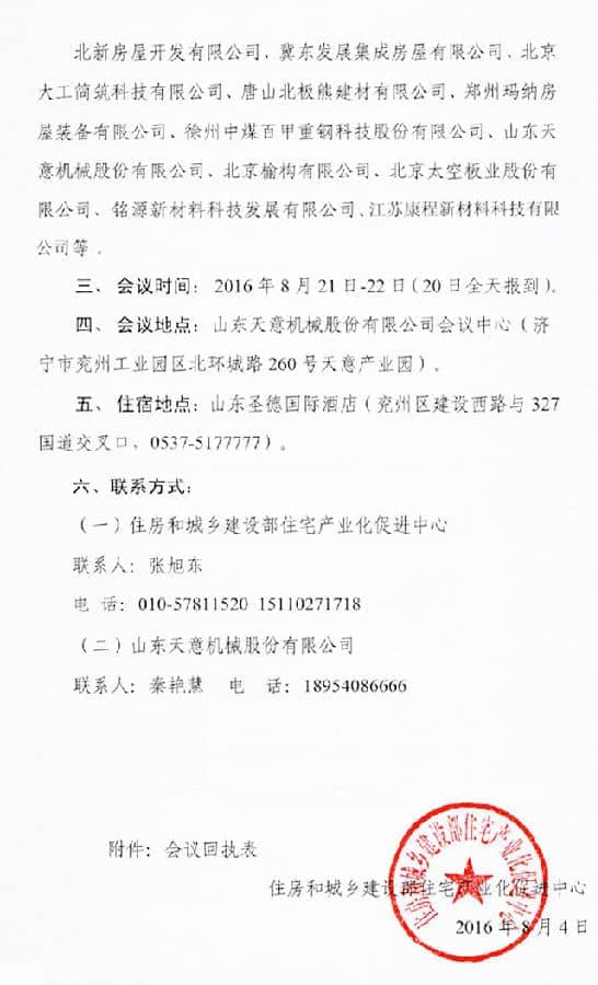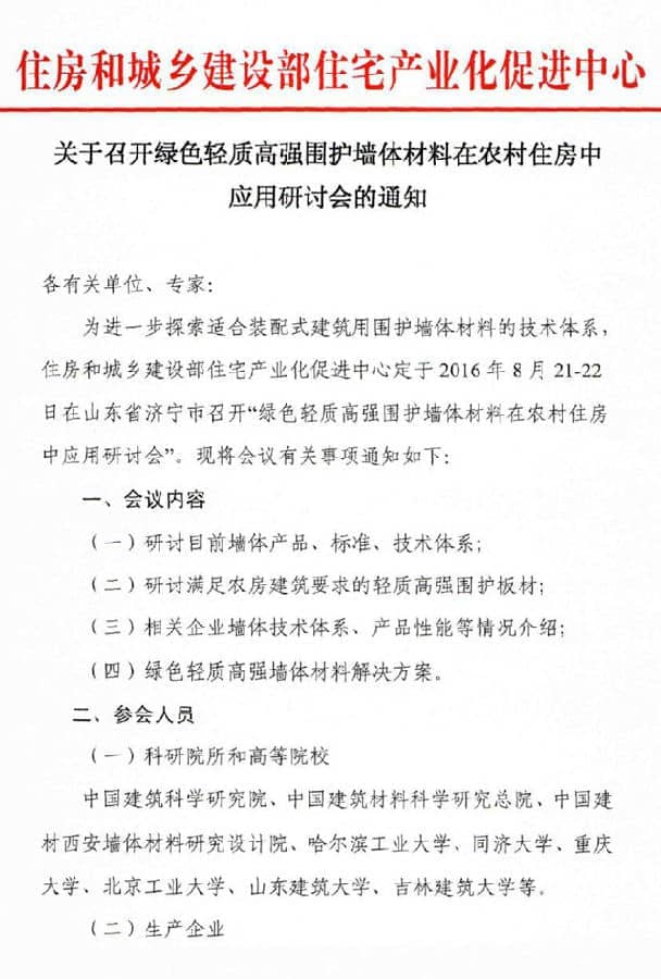 为进一步探索适合装配式建筑用围护墙体材料的技术体系,住房和城乡建设部住宅产业化促进中心定于2016年8月21-22日在山东济宁市兖州区召开“绿色轻质高强围护墙体材料在农村住房中应用研讨会”。