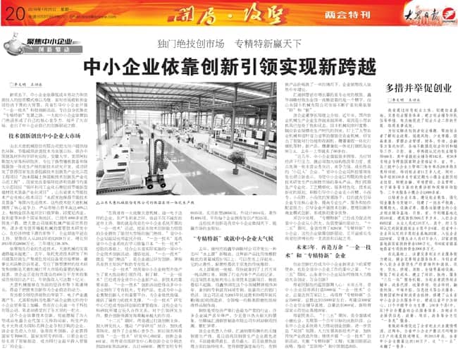 2015年1月25日的大众日报・两会特刊《独门绝技创市场 专精特新赢天下――中小企业依靠创新引领实现新跨越》重点介绍了我公司技术创新的经验,敬请关注。