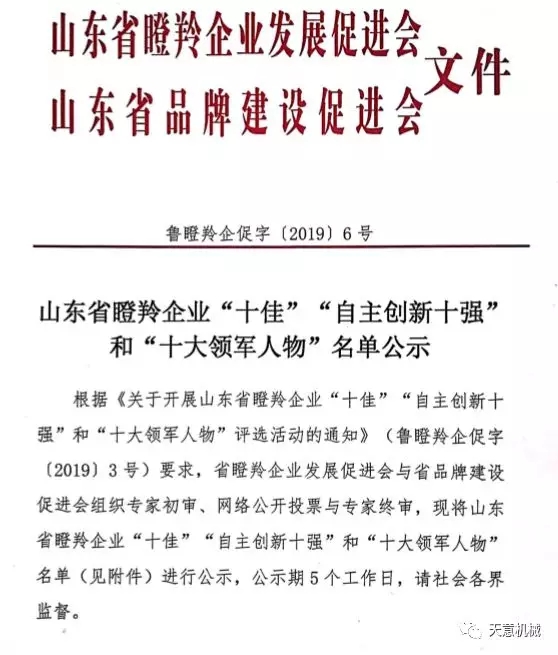 根据《关于开展山东省瞪羚企业“十佳”“自主创新十强”和“十大领军人物”评选活动的通知》(鲁瞪羚企促字〔2019〕3号)要求,2019年12月6日,山东省瞪羚企业发展促进会、山东省品牌建设促进会发布鲁瞪羚企促字[2019]6号文,公布经过专家初审、网络公开投票与专家终审,评选出了山东省瞪羚企业“十佳”、“自主创新十强”和“十大领军人物”。完美(中国)机械荣获“山东省十佳瞪羚企业”称号。
