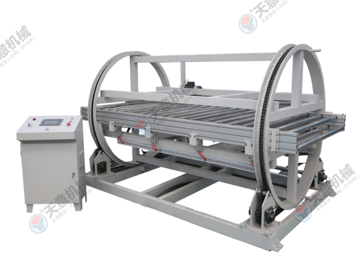 适用于平面门板、橱柜侧板、硅酸盖板、玻镁板、水泥纤维板等板式工件,配套连线作业时进行180°自动翻面1.翻转电机1.5KW(带抱闸),输送电机0.75KW。2.翻转传动链条采用16A链条,承载能力高,动载荷大。3.采用独立电箱控制,操作控制简单方便4.设备两侧具有钢丝网保护,提高设备安全性能